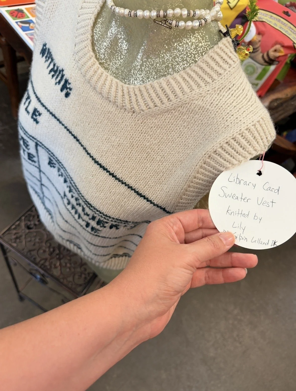 Cute knit vest pattern on display at The Little Knittery on Vermont