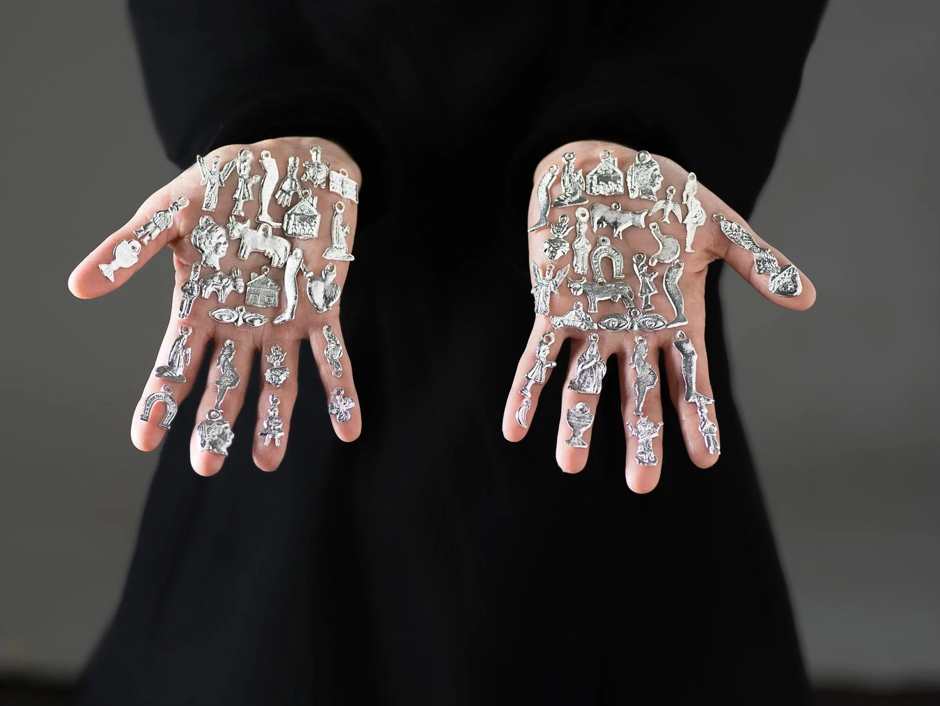 Her grandmother’s echoes continue to inspire her. “Let me tell you about the beauty and the pain, let me try in this language, or a different language, object, performance, image, something you can put on,” she says about her “multilingual” approach, which she infuses in all of her work, whether sourcing Old Miner diamonds which sparkle best by candlelight and sunshine. Or what she calls “milagros”—miracles embedded in found objects—silver charms featuring everyday objects, tools, parts of the body as a way to direct prayer.